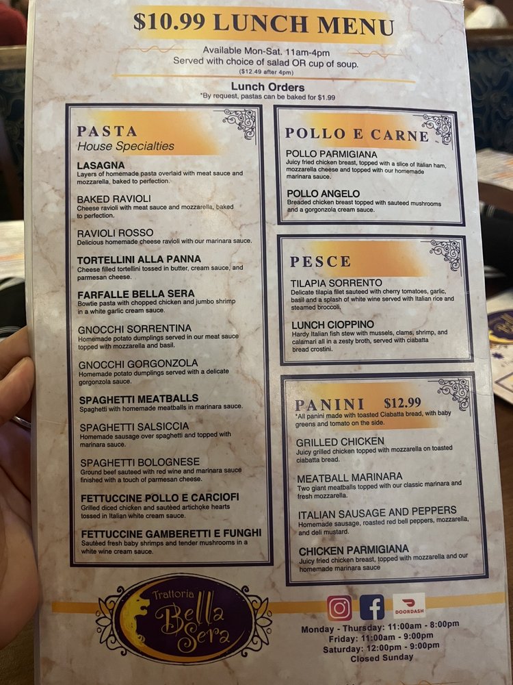 With delightful dishes, attentive service like "Ali's," and superb portion sizes, Trattoria Bella Sera promises a satisfying dining experience that will leave you wanting more.